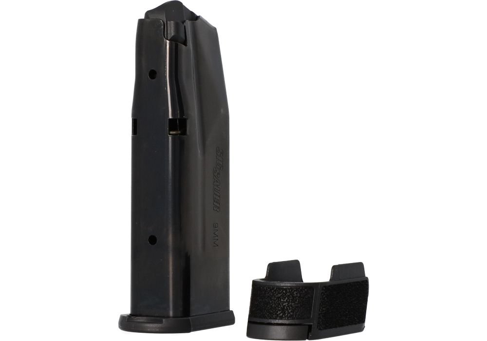 Extended 12-round steel magazine for the P365, P365X, and P365XL micro-compact pistols. It fits flush in the P365X, P365XL, and extended in the P365.